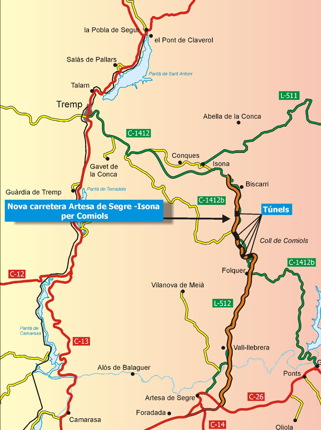 Per tal de potenciar les comunicacions entre aquestes dues comarques, així com afavorir l’accessibilitat al Pirineu, el DPTOP ha impulsat la construcció d’una nova carretera entre Artesa de Segre i Isona, pel coll de Comiols, que permetrà millorar les prestacions de l’itinerari actual, la seguretat viària i la comoditat en la conducció. La construcció d’aquesta nova via comportarà una inversió estimada de 106, 3 MEUR.