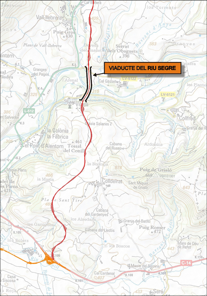 Al llarg d’aquest tram, cal destacar la construcció d’un viaducte de 757 metres de longitud sobre el riu Segre i sobre les carreteres LV-5121 (d’accés a Collfred) i LV-5122 (d’accés a Anya).
