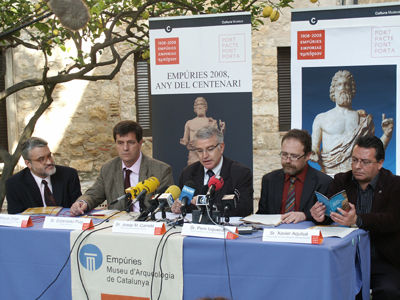 El director general de Patrimoni Cultural, Josep M. Carreté, i l’alcalde de l’Escala, Estanislau Puig, han presentat avui en roda de premsa els actes de commemoració del centenari de les excavacions d’Empúries, que inclouen exposicions i activitats científiques, divulgatives i lúdiques. També han assistit a la roda de premsa el director del Museu d’Arqueologia de Catalunya (MAC), Pere Izquierdo; el director dels Serveis Territorials de Cultura i Mitjans de Comunicació a Girona, Miquel Sitjar, i el director del MAC a Empúries, Xavier Aquilué.