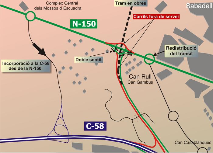 Les restriccions consistiran en el tall del ramal de sortida des de la rotonda cap a la C-58, de manera que els vehicles que vulguin accedir a l’autopista des de la nacional, hauran de fer-ho des de la rotonda del Complex Central dels Mossos d’Esquadra. En canvi, els moviments d’incorporació des de l’autopista C-58 a la nacional no es veuran afectats. Així, l’N-150 no patirà cap restricció de carrils, però sí que es desviarà el trànsit per un costat o l’altre de la rotonda, en funció del desenvolupament dels treballs en cada fase de les obres.