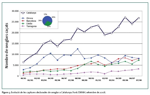 En el període de caça 2007-2008, s’han capturat 26.776 senglars, cosa que representa un augment de l’11% respecte de la temporada anterior. Des de la temporada 1990-1991, en què es van caçar 6.453 senglars, s’ha observat un important augment dels senglars caçats, amb un màxim assolit el 2005-2006 de 27.102 captures.