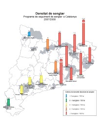 - Especialment a les comarques de Barcelona, les poblacions de senglar s’estan expandint de manera molt important i s’han assolit densitats per sobre dels 8 senglars/100 ha al Montseny i al Montnegre i el Corredor