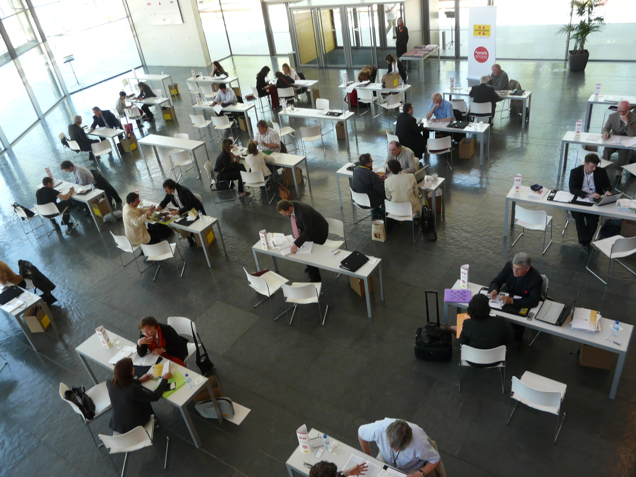 S’adjunta una fotografia d’una de les sales de l’Auditori-Palau de Congressos de Girona amb les taules de reunió d’operadors i sector turístic català.