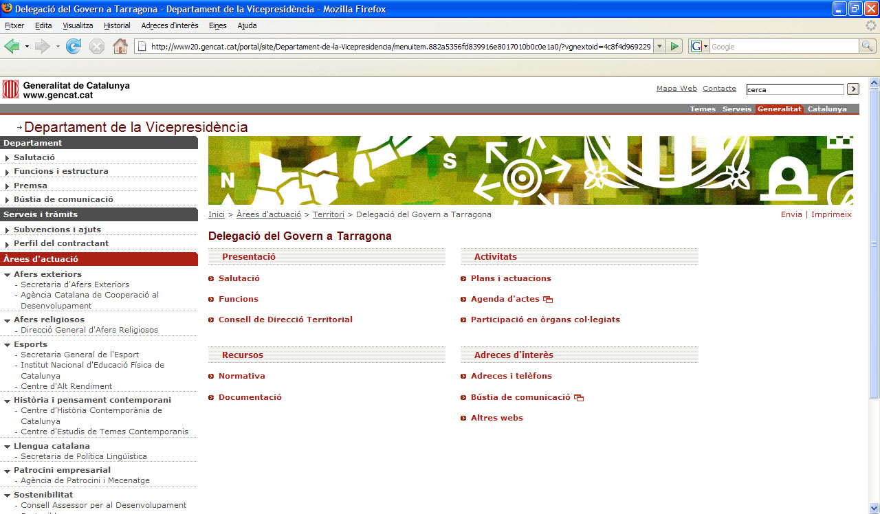 La Delegació del Govern a Tarragona acaba d’estrenar el web http://www.gencat.cat/vicepresidencia/delegacio-tarragona. Es tracta d’un nou canal de comunicació entre el Govern de la Generalitat i la ciutadania del Camp de Tarragona que inclou l’activitat i les funcions de la Delegació territorial del Govern, les principals línies d’actuació i els projectes previstos.