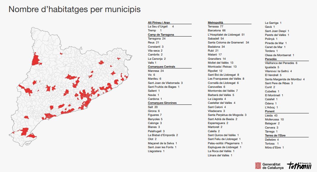 Un altre element positiu de la compra dels 743 pisos que ha destacat la consellera és que “es troben situats a gairebé un centenar de municipis de tot Catalunya”. Amb la seva compra en bloc “impactem no només en zones d’alta densitat sinó arreu” del territori. La distribució dels 743 habitatges és la següent: