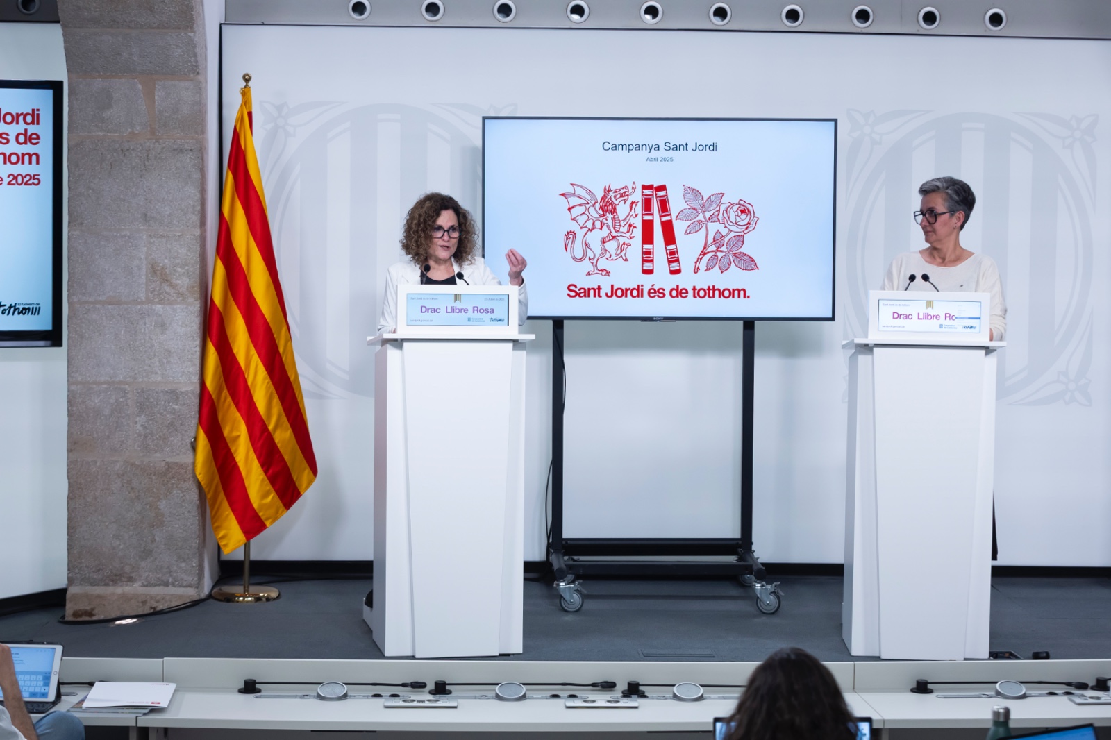 La consellera de Cultura, Sònia Hernández Almodóvar, ha explicat avui en roda de premsa al Palau de la Generalitat les activitats que organitza la Generalitat de Catalunya per a la diada de Sant Jordi 2025. La consellera ha estat acompanyada de la directora general de Difusió, Bet Valls, que ha presentat la imatge de la campanya d’enguany per a Sant Jordi.