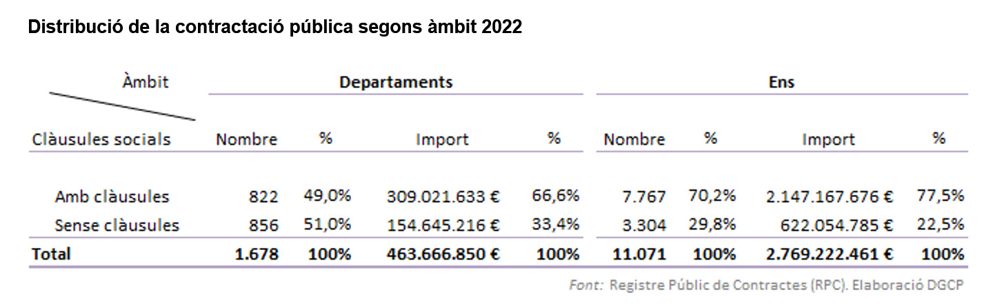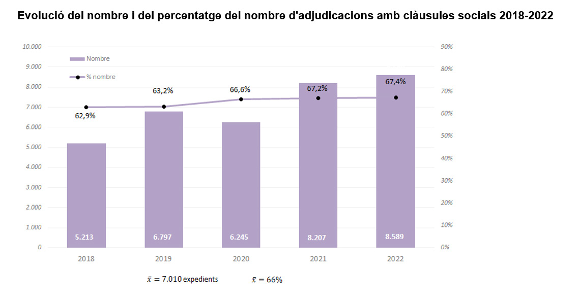 La Generalitat de Catalunya i els ens que configuren el seu sector públic van adjudicar l’any 2022 un total de 12.749 contractes, per un import de 3.232 milions d’euros. D’aquests, el 67,4% (8.589) van incorporar clàusules socials, el percentatge més alt dels darrers cinc anys. Si aquesta xifra es llegeix des de la vessant de l’import, el percentatge se situa en el 76% (2.456 M€). “Aquestes dades constaten una recuperació després dels efectes de la pandèmia de la COVID-19” i “la tendència a l’alça pel que fa a la proporció i al nombre de contractes que incorporen aquesta tipologia de clàusula”.
