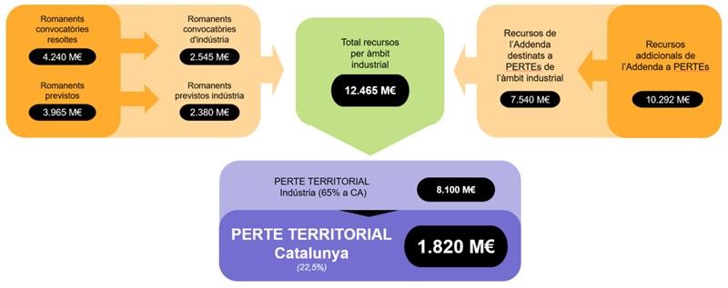El finançament del Perte territorial provindria tant dels recursos que han quedat sense adjudicatari en les convocatòries industrials realitzades fins ara (2.545 M€) com dels fons que es preveu que no s’adjudiquin en la primera fase del desplegament dels Next Generation a Espanya (2.380 M€). També es nodriria de la part de l’Addenda (com es coneix el segon tram dels Next Generation que arribarà a l’Estat) que previsiblement es destinarà a la indústria (i que suma 7.450 M€). La Generalitat proposa posar el 65% d’aquests recursos a disposició de les comunitats autònomes (8.100M) dels quals correspondrien a Catalunya un total de 1.820 milions d’euros, el 22,5% del total, d’acord amb el seu pes en el sector industrial a l’Estat.