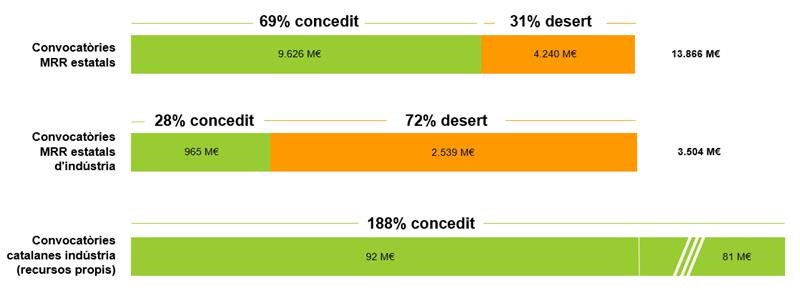 El desplegament del Pla de Recuperació, Transformació i Resiliència (PRTR), està sent ineficaç a l’hora de recolzar els projectes empresarials, especialment els vinculats a l’àmbit de la indústria. Si el nombre de recursos sense adjudicatari arriba al 31%, en el cas de la indústria el percentatge es dispara fins al 72%. Són 2.539 milions d’euros que s’han quedat sense repartir. En canvi, la Generalitat ha concedit el 188% de les principals convocatòries d’ajut a la indústria que ha posat a disposició del teixit empresarial amb recursos propis des de l’any 2021. Que la concessió de fons per part del Govern superi el 100% es deu a què, vist l’èxit de les convocatòries, la Generalitat les ha ampliat per poder arribar al màxim d’empreses possible.