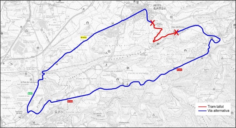 Així, es tancarà al trànsit el tram de la carretera B-431 entre el carrer de Ponent (urbanització Vista Pirineu) i el carrer del Doctor Claudio Salas (nucli d’Artés). Els vehicles s’hauran de desviar per les carreteres N-141c, B-451 i BV-4512. Els itineraris estaran convenientment senyalitzats.
