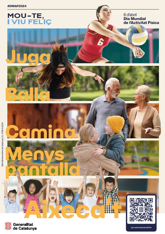 Per quinzè any consecutiu, el Govern de la Generalitat de Catalunya s’ha adherit a la campanya del Dia Mundial de l’Activitat Física (DMAF), que se celebra arreu del món el dia 6 d’abril, aquest any sota el lema “Mou-te, i viu feliç”. La iniciativa està impulsada pel Departament de la Presidència, a través d'Esportcat, i el Departament de Salut, i té la finalitat de fer visible la importància d’una vida activa per a una bona salut.