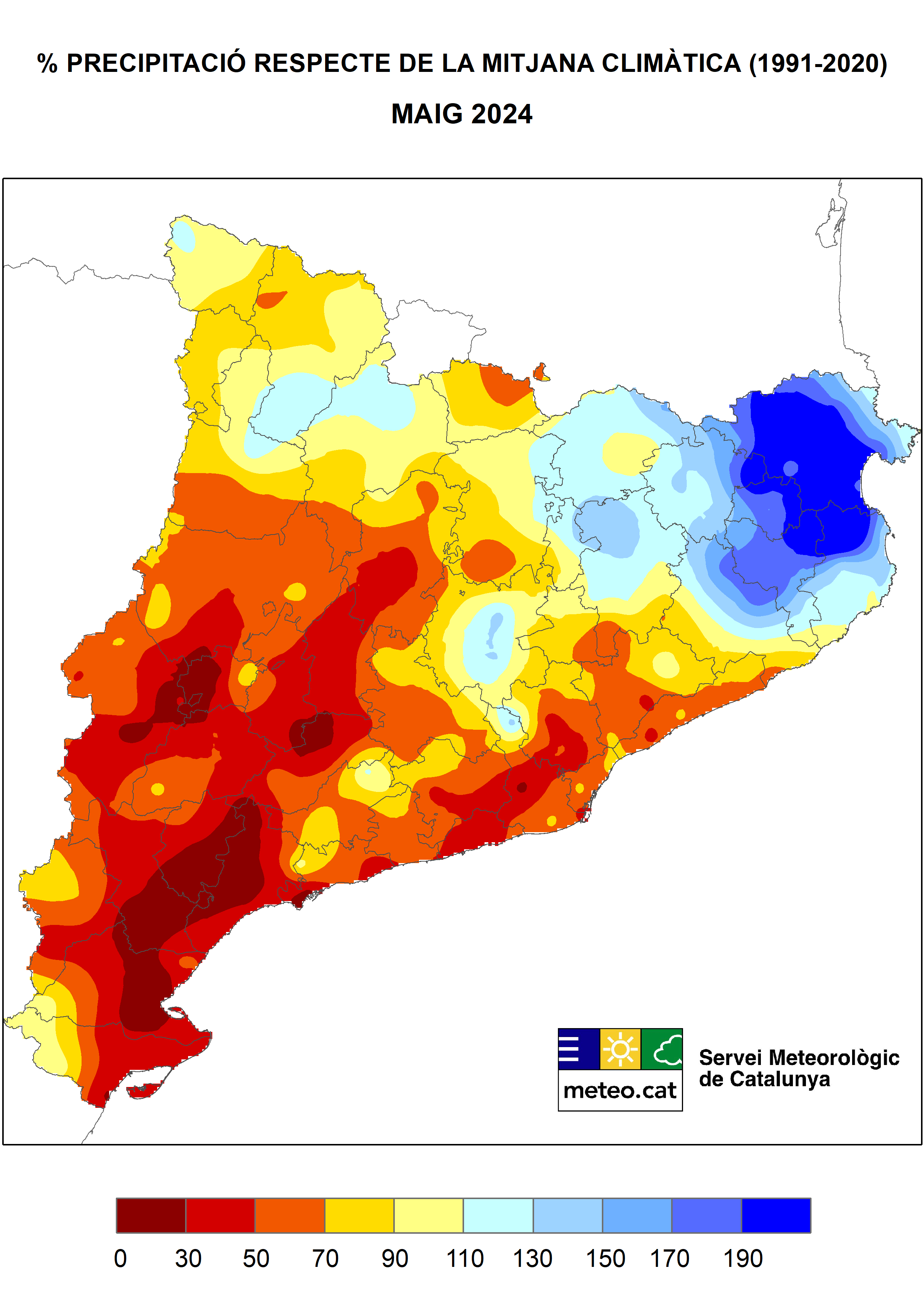 D’aquesta manera, si bé el mes de maig ha deixat registres per sobre dels 40 mm a gran part de la meitat nord del país i dels 80 mm al Prepirineu i més de 100 mm al Pirineu (126,8 mm a Certascan (2.400 m) com a exemple), aquestes quantitats no han estat suficients per a arribar a la mitjana climàtica quedant un mapa d’anomalies amb predomini dels colors groguencs, ataronjats, i els vermellosos al sud. Tan sols les quantitats abundants que ha registrat el quadrant nord-est, especialment l’Empordà, han aconseguit superar la mitjana climàtica.