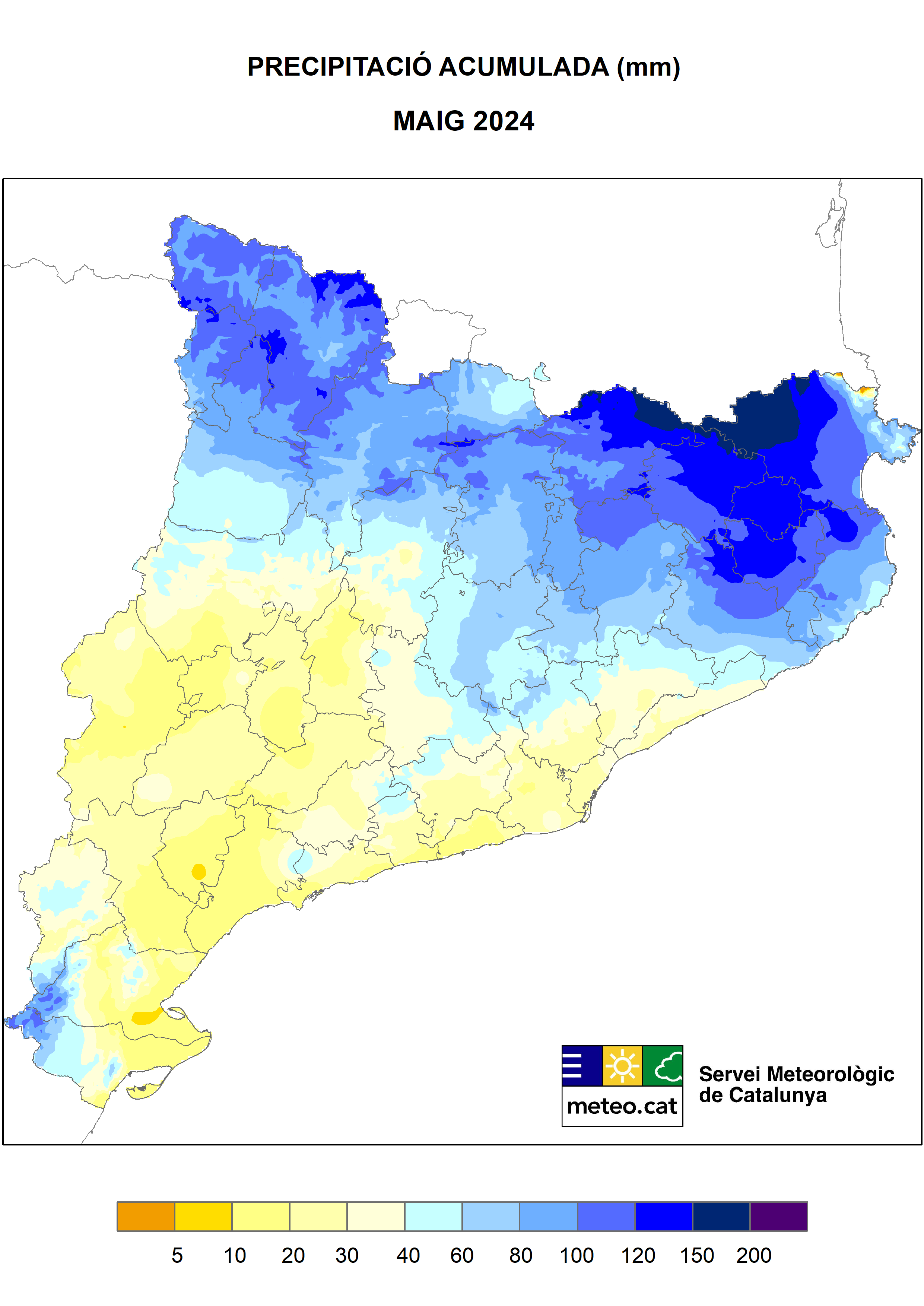 El mes de maig ha estat sec i molt sec a punts del prelitoral i litoral sud i de la plana de Lleida. En canvi, ha estat plujós al quadrant nord-est i alguna zona del Pirineu occidental, i molt plujós a l’Alt Empordà, nord del Baix Empordà i extrem nord del Gironès