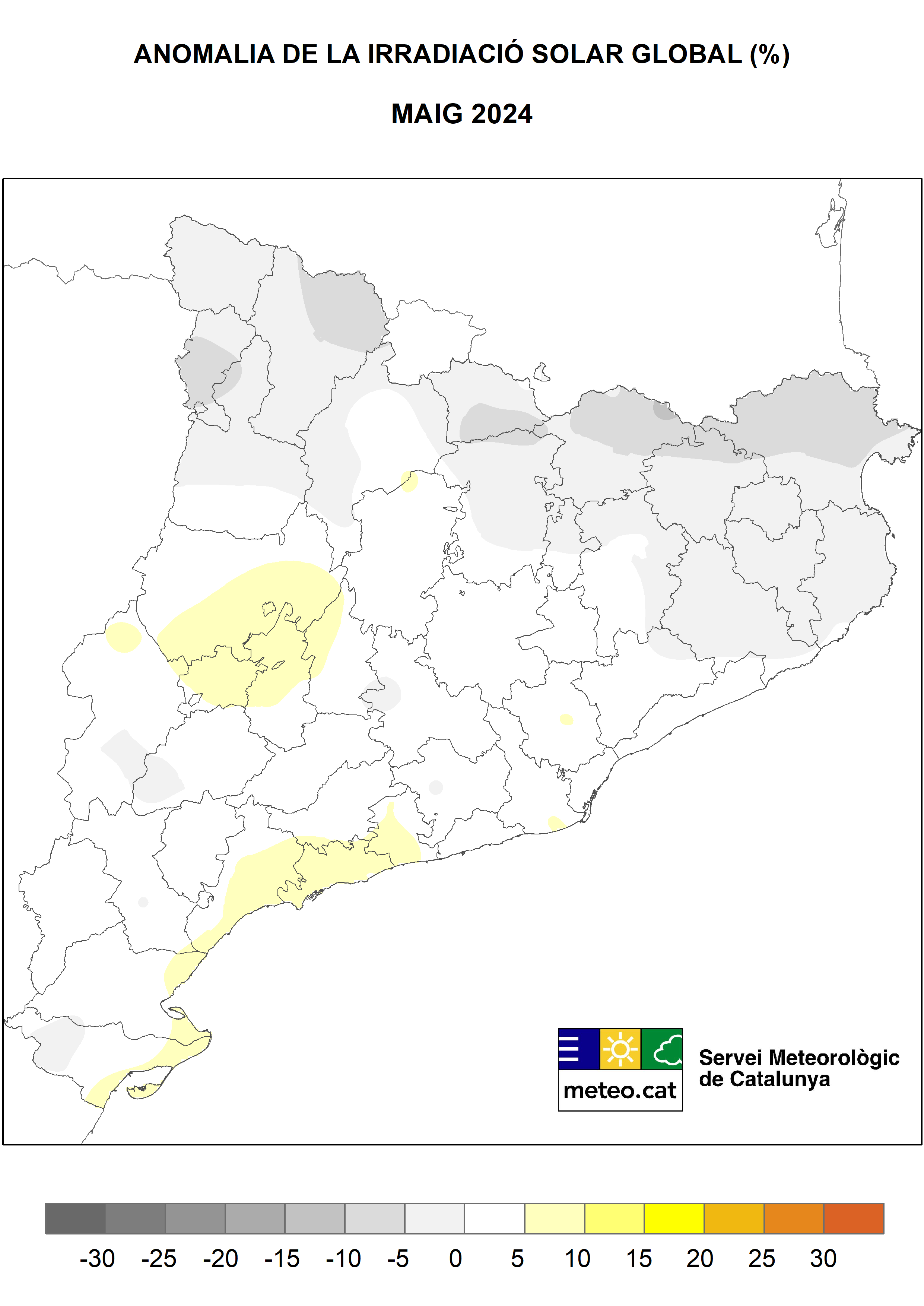 Mapa d’anomalia d’irradiació solar global del mes de maig del 2024 respecte de la mitjana dels últims 10 anys