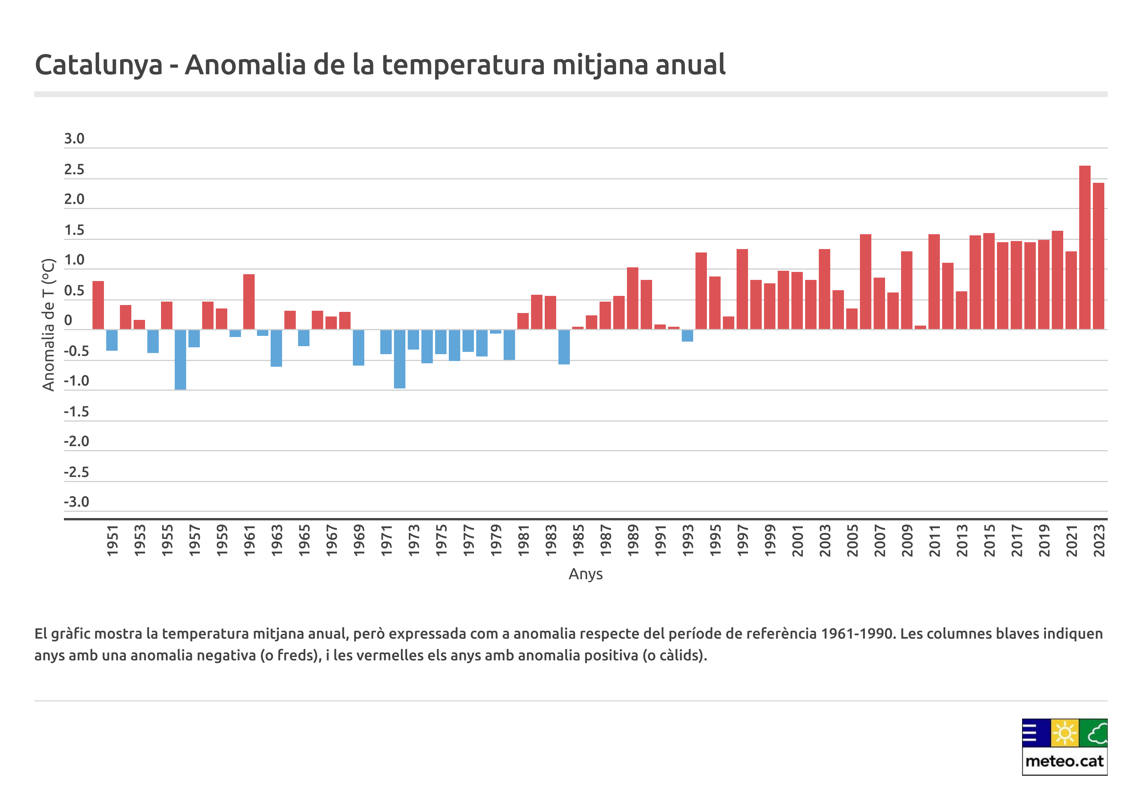 Una de les principals conclusions del Butlletí Anual d’Indicadors Climàtics (BAIC 2023), que emet anualment el Servei Meteorològic de Catalunya (SMC), indica que l’any 2023 va continuar el patró de l’any anterior, essent el segon any més càlid a Catalunya des de 1950, amb una anomalia (diferència respecte del període de referència 1961-1990) de +2,4 °C. En els darrers 74 anys només s’han superat els 2 ºC d’anomalia els anys 2022 i 2023. Es manté el clar predomini d’anys càlids durant els darrers vint anys, i els 10 anys més càlids a Catalunya des de 1950 s’han registrat en el període 2006-2022 (2022, 2023, 2020, 2015, 2006, 2011, 2014, 2019, 2017 i 2016).