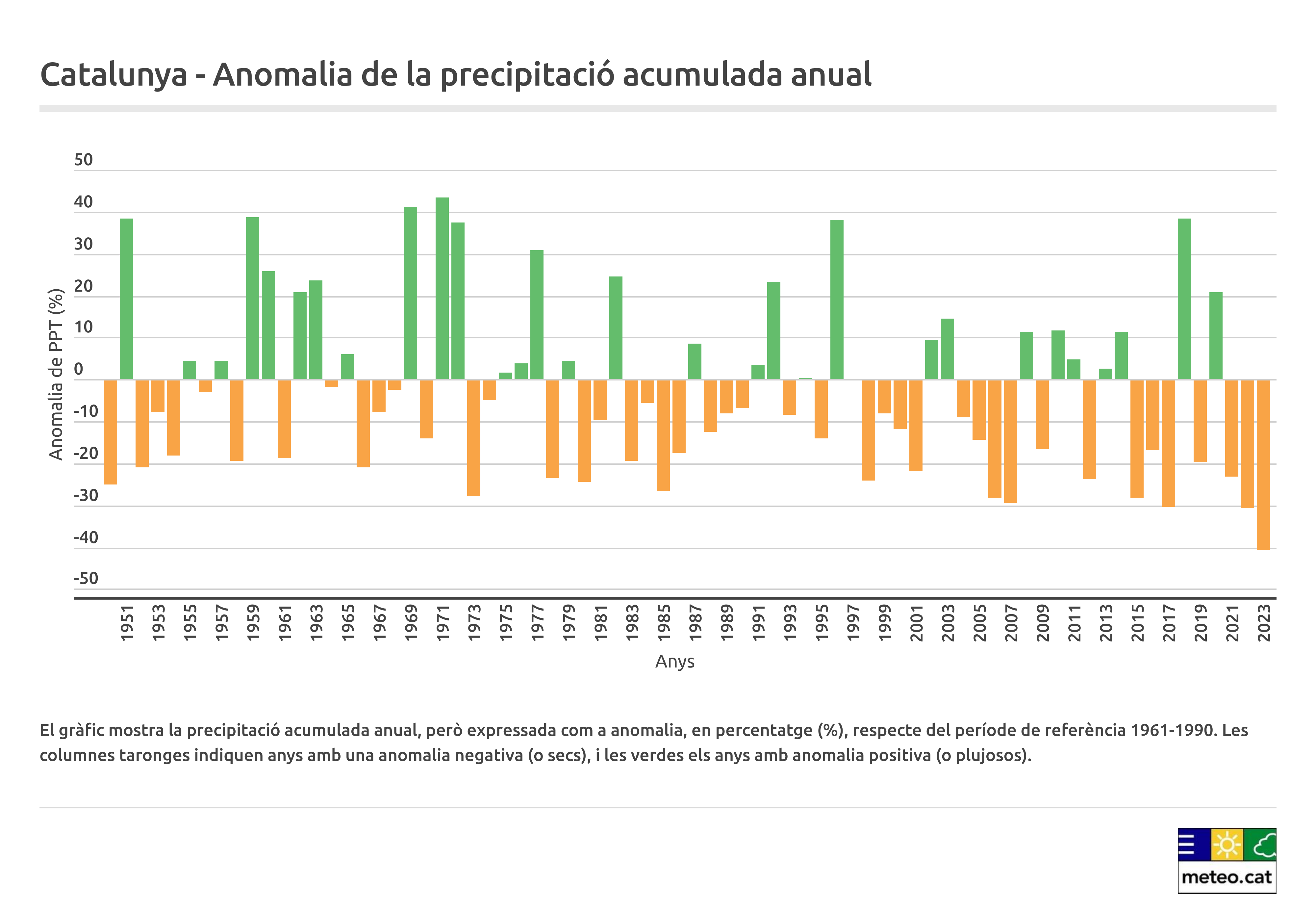 Quant a la precipitació, l’any 2023 ha estat el més sec per al conjunt de Catalunya, amb una anomalia de -40,4 % respecte de la mitjana climàtica del període 1961-1990. Els 6 anys més secs a Catalunya des de 1950 s’han registrat en el període 2006-2023 (2023, 2022, 2017, 2007, 2015 i 2006).