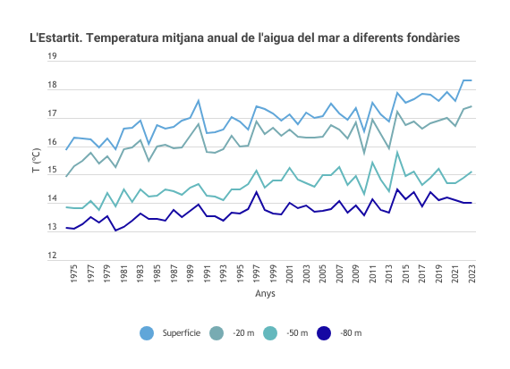 - En el període 1974-2023, la temperatura de l’aigua del mar a l’Estartit (el Baix Empordà) ha augmentat a un ritme de 0,3 °C/decenni en els primers 20 metres de profunditat i de 0,2 °C/decenni de 50 a 80 metres de fondària. Durant l’any 2023, la temperatura mitjana anual de l’aigua superficial en aquest punt del litoral ha estat igual que la de l’any anterior, amb un valor de 18,3 ºC (el més elevat des de 1974 i superant per segon any consecutiu el llindar dels 18 ºC). El nivell del mar al mateix entorn geogràfic ha augmentat en els darrers 34 anys (1990-2023) a un ritme de 3,0 cm/decenni, és a dir, uns 10 cm en tot el període.