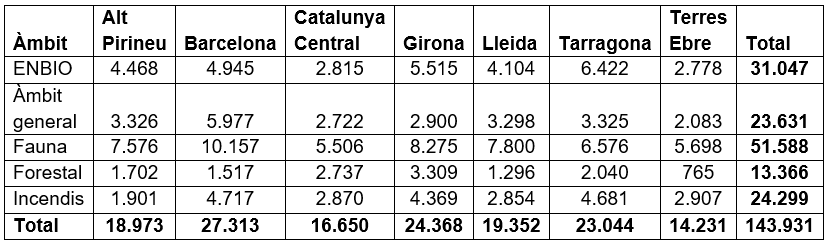 En segon lloc, amb 31.047 actuacions, es troben les feines que desenvolupen els Agents Rurals agrupades en l’Àrea ENBIO (Espais naturals protegits i biodiversitat). Es tracta d’actuacions com la vigilància d’espais naturals, la regulació d’afluència de vehicles i persones, la inspecció i vigilància d’elements del patrimoni cultural, abocaments o proves esportives. També actuacions per contaminació d’aigües, esllavissades, inundacions o afectacions per aplicació de productesfitosanitaris.