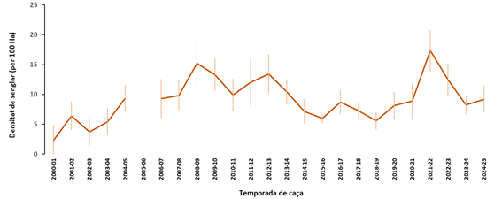 Les estimes de l’abundància de les poblacions de senglar a Collserola que s’extreuen de les batudes de caça indiquen que aquest hivern 2024-25 s’ha mantingut similar a la temporada anterior. Així, la densitat mitjana calculada és de 9,2 exemplars per km2 i es manté per sota dels alts nivells assolits durant la temporada 2021-22.