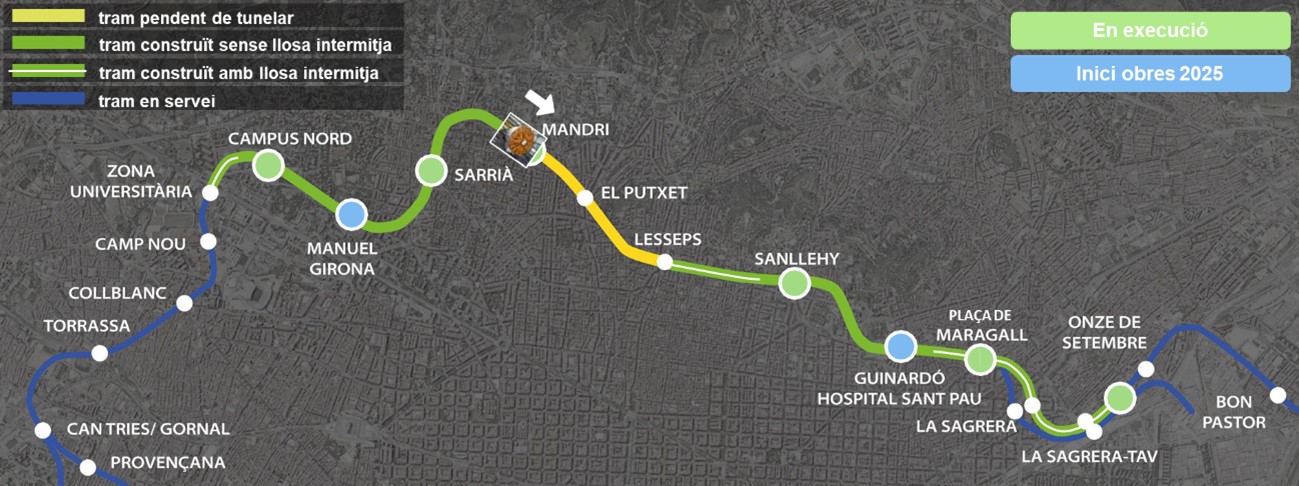 En el marc de les obres de l’L9/L10, el Departament està treballant actualment en les estacions de Mandri, Sarrià, Plaça de Maragall i Sanllehy, i pròximament iniciarà les obres d’estructura interior de l’estació de Guinardó. Així mateix, està actuant en l’àmbit de Macropou de la Sagrera,