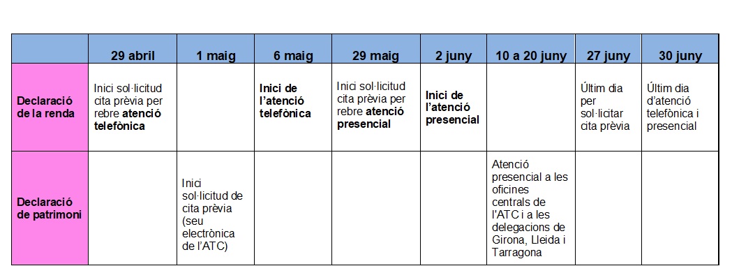 - Els contribuents que necessitin ajuda per fer la declaració poden demanar dia i hora a través de l’app i del web de l’ATC o al telèfon 901 22 33 44, a partir de demà, 29 d’abril