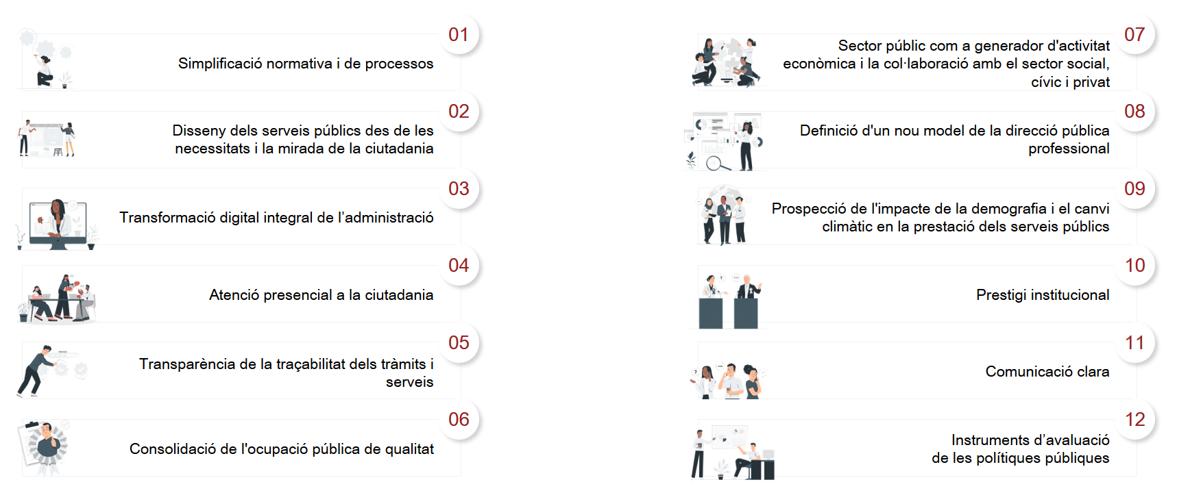 L’acord de Govern GOV/217/2024, de 8 d'octubre, que defineix l’estratègia de reforma de l’Administració inclou com a segon eix bàsic la posada en marxa d’un pla de xoc amb mesures d’aplicació urgent. Conté un total de 17 accions per dur a terme millores a curt termini en el sector públic. Es divideixen en tres àmbits: funció pública, serveis i tràmits, i administració i organització.