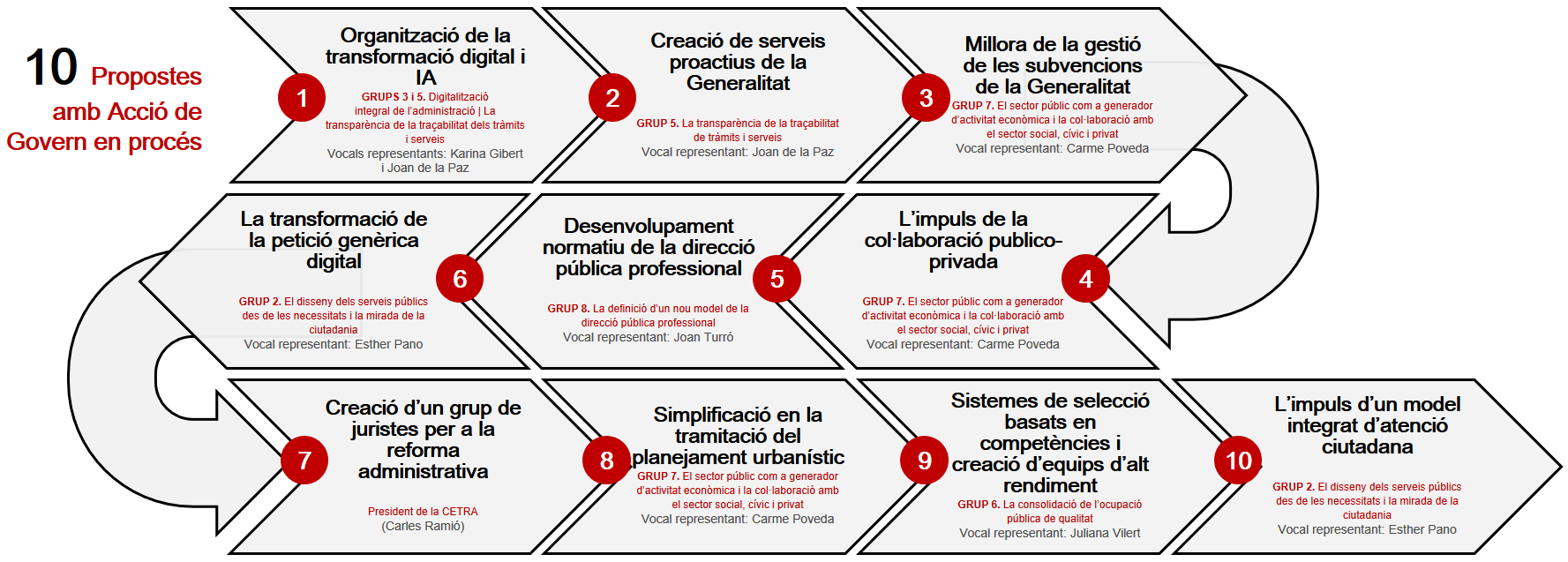 La reforma de l’Administració avança. En l’equador dels treballs de la Comissió d’experts per a la definició de l’estratègia de transformació de l’Administració de la Generalitat de Catalunya i la millora dels serveis públics (CETRA), que es va posar en marxa el novembre passat amb un horitzó de deu mesos per presentar el conjunt de les propostes, el Govern ja ha activat les 10 primeres mesures que sorgeixen de la feina feta fins ara per la pròpia comissió. Paral·lelament, el pla de xoc amb mesures immediates que acompanya el procés ha completat ja més de la meitat de les tasques previstes. Així doncs, la renovació dels serveis públics i de la gestió pública continua fent passos endavant per donar resposta a les necessitats socials i econòmiques actuals del país.