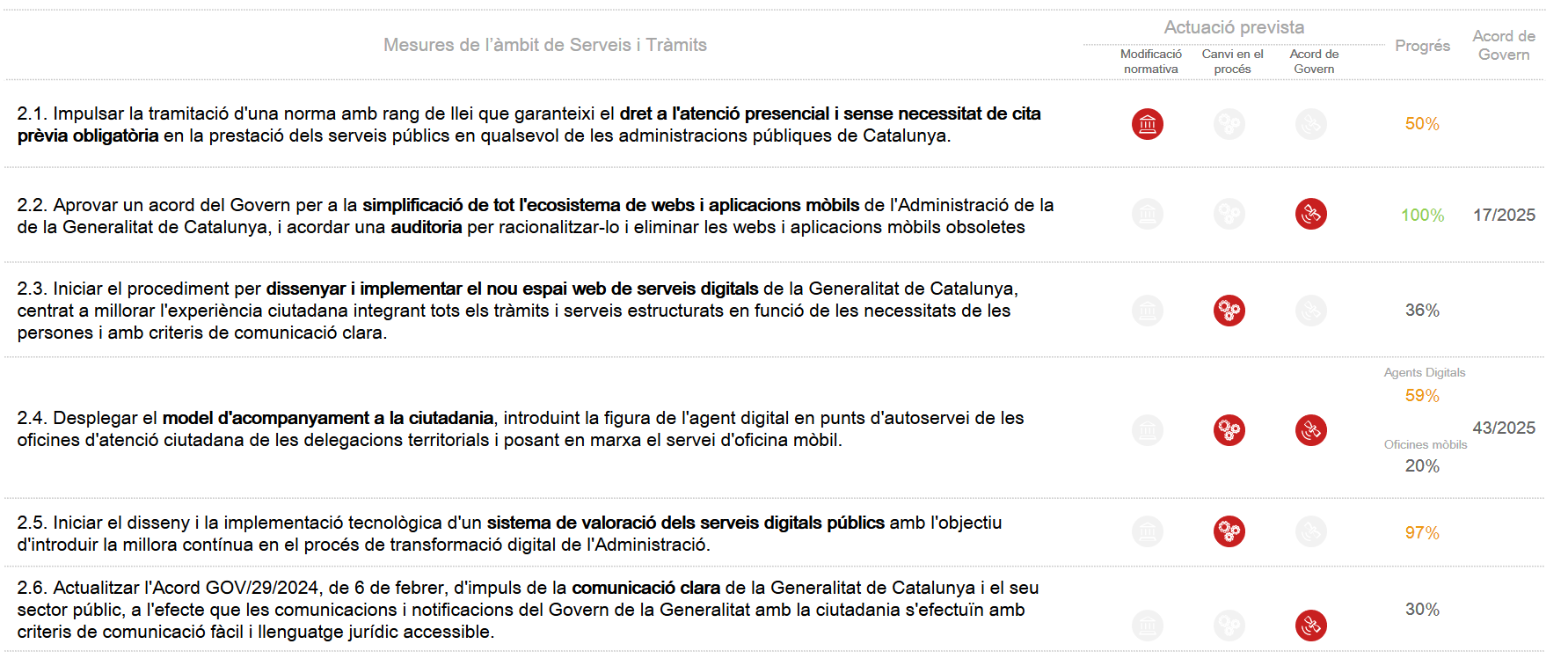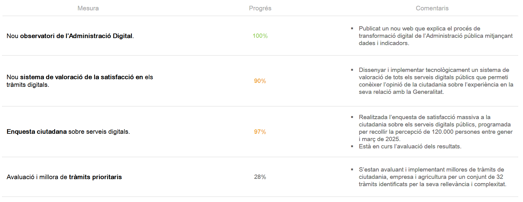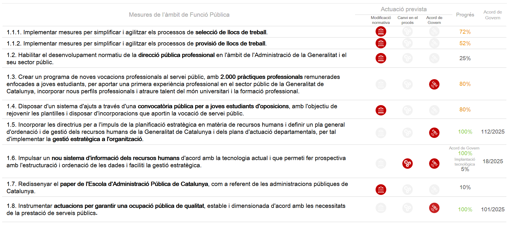 Pel que fa a la resta de mesures, n’hi ha nou de completades en més del 50%. Entre elles, destaquen la creació de 2.000 places de pràctiques remunerades per a joves estudiants per atraure talent del món universitari, la implementació de mesures per simplificar i agilitzar els processos de selecció i provisió de llocs de treball i la creació d'un sistema de valoració de la satisfacció en els tràmits digitals.
